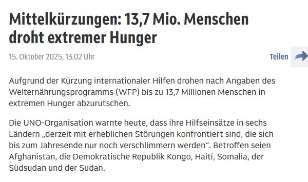 Wie am 15.10.2025 auf orf.at zu lesen war, droht insbesondere 6 Ländern aufgrund der Kürzung internationaler Hilfen eine extreme Hungersnot. Das Welternährungsprogramm (WFP) ... Weitere Infos ...